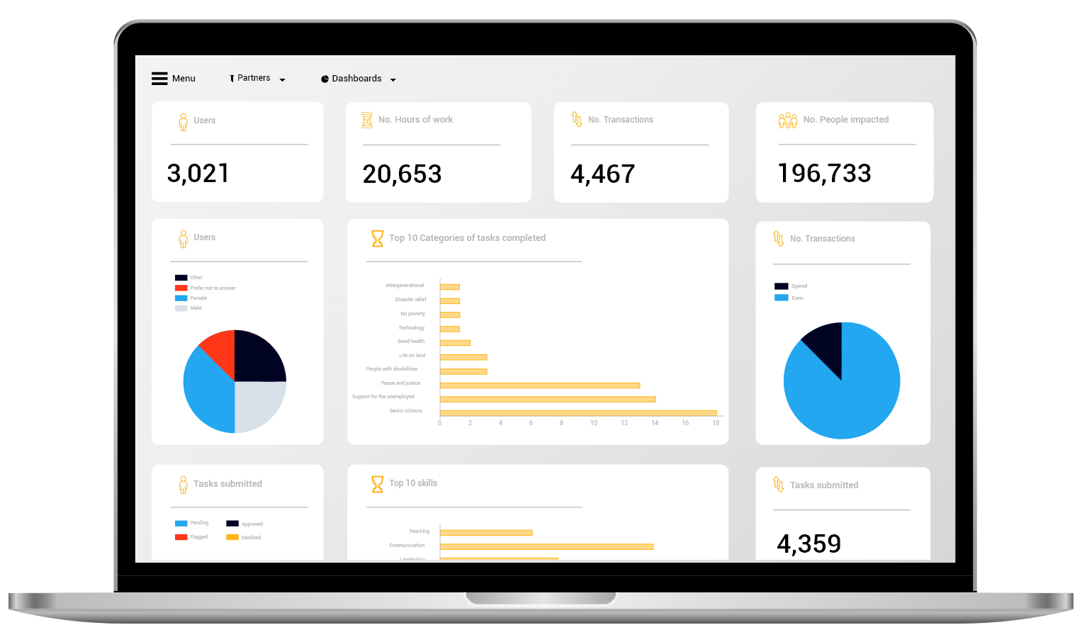 The dashboard also allows the admins to monitor key data like attendance registers, skills gained by users, SDG goals solved by their organisation and measure impact.